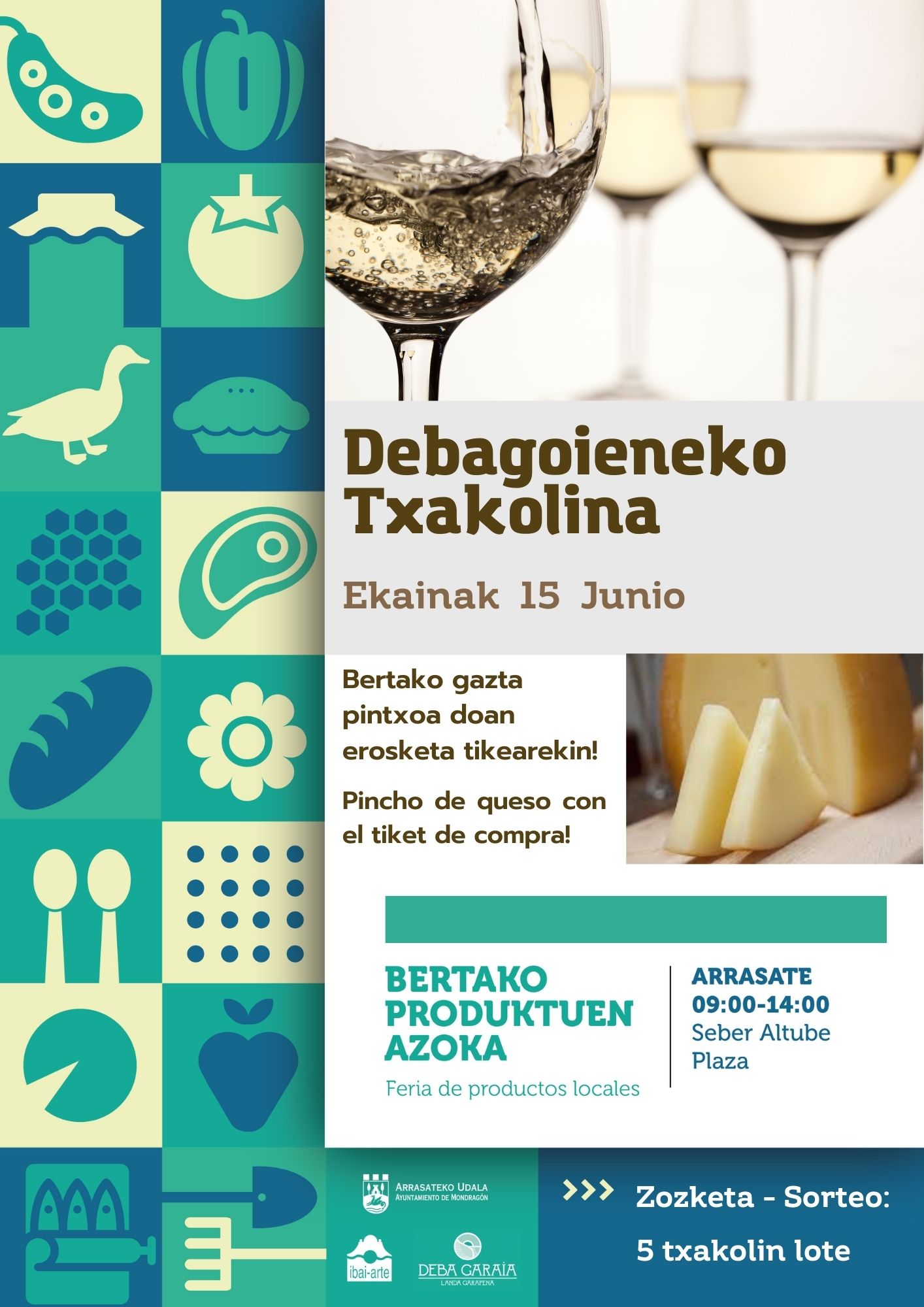 Eskualdeko MURGIALDAI eta BELASKUA txakolina dastatzeko eta erosteko aukera egongo da. Gazta pintxoak ere egongo dira. 5 txakolin lote zozketatuko dira.
