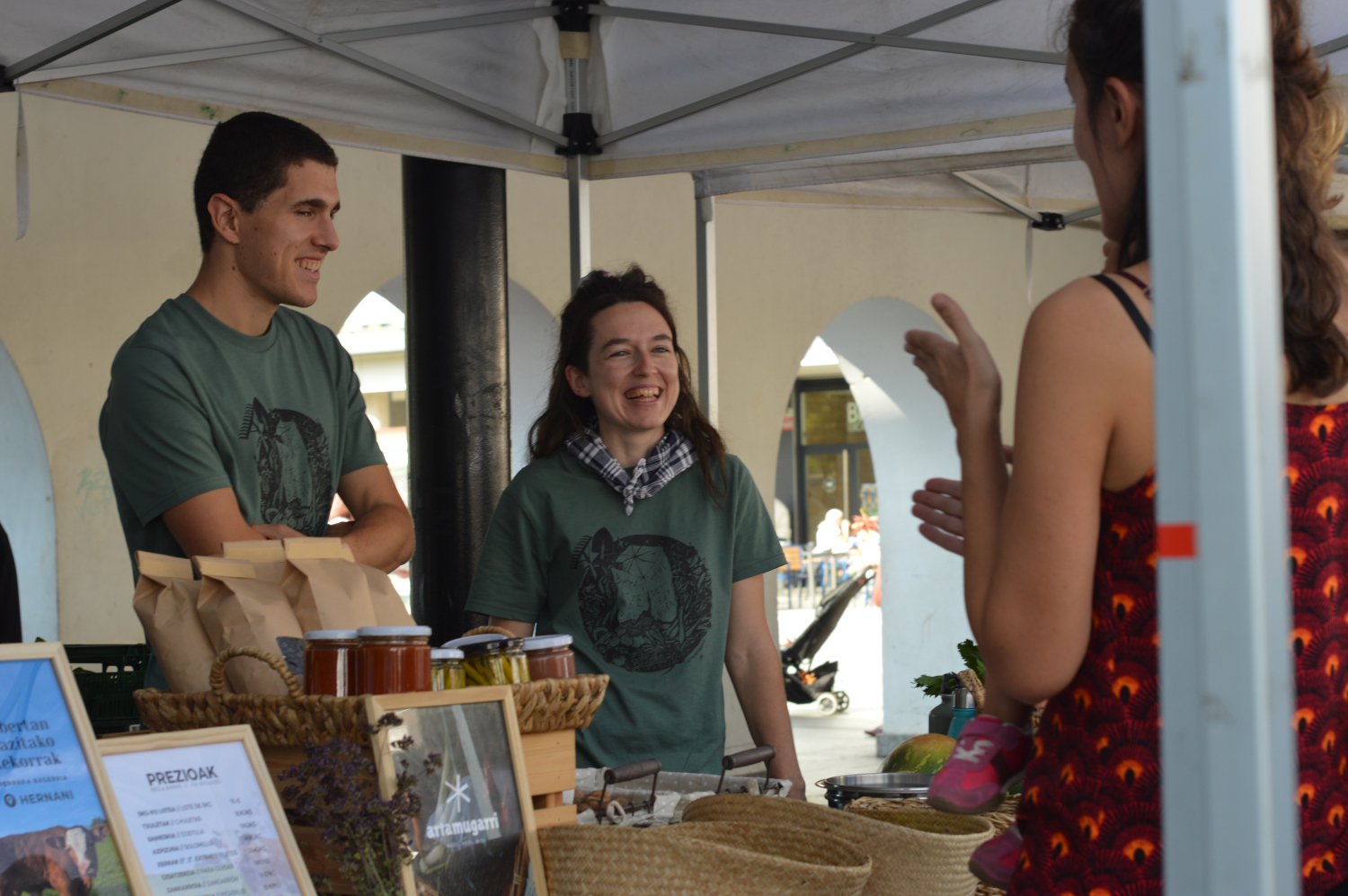 Azoka bakoitzean produktuen aniztasuna eskaintzen saiatzen dira kolektibotik. Ilustrazioa, bitxiak, osagarriak, kosmetika naturala, zeramika eta bestelako postuak izaten dira azoketan sortzaileen aldetik, eta elikagaietan, berriz, ogia, esnekiak, barazkiak, kontserbak, pasta, haragia eta beste zenbait produktu. “Ahal dugun neurrian, saiatzen gara asteko menu osoa osatzeko saskia eskaintzen azoketan”, dio. Eta, azoka berean produktuak asko ez errepikatzea ere bilatzen dute: “Azoka anitzak bultzatu nahi ditugu, alegia, produktu beraren lau postu ez izatea azoka bakarrean, ez errepikatzea”.