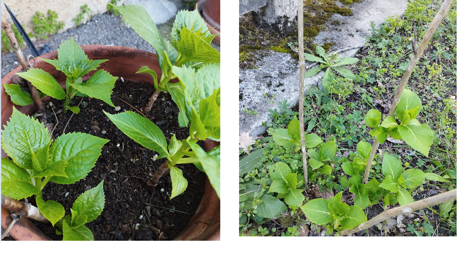 Kaixo, Jakoba: Iaz 3 hortentsia aldaxka sartu nituen lurrean eta beste 4 loreontzian. Ez nuen uste guztiek aurrera egingo zutenik, baina horrela izan da, eta orain horrela daude. Bi galdera: 1) Loreontzian dauden hortentsiak noiz landatuko ditut lurrean? 2) Lurrean dauden hortentsiak gertuegi daudela iruditzen zait. Horrela utzi ditzazket edo sakabanatuago jarri behar ditut? Horrela bada, noiz egin beharko nuke hau? Eskerrik asko!