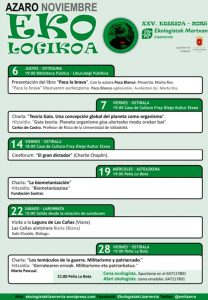 Zikloa azaroaren 28an amaituko da, ostirala, La Bota peñan 19:00etan Gerratearen erroak. Militarismo eta patriarkatuahitzaldia emango du Marta Pascualek. Marta Pascual irakaslea da eta Ekologistak Martxan, Klimaren aldeko Feministak eta M8ko Batzordean aktibista. Ondoren, 21:00etan, urteroko afari ekologista egingo da Botan. Izena emateko 647117801 telefonora dei daiteke.